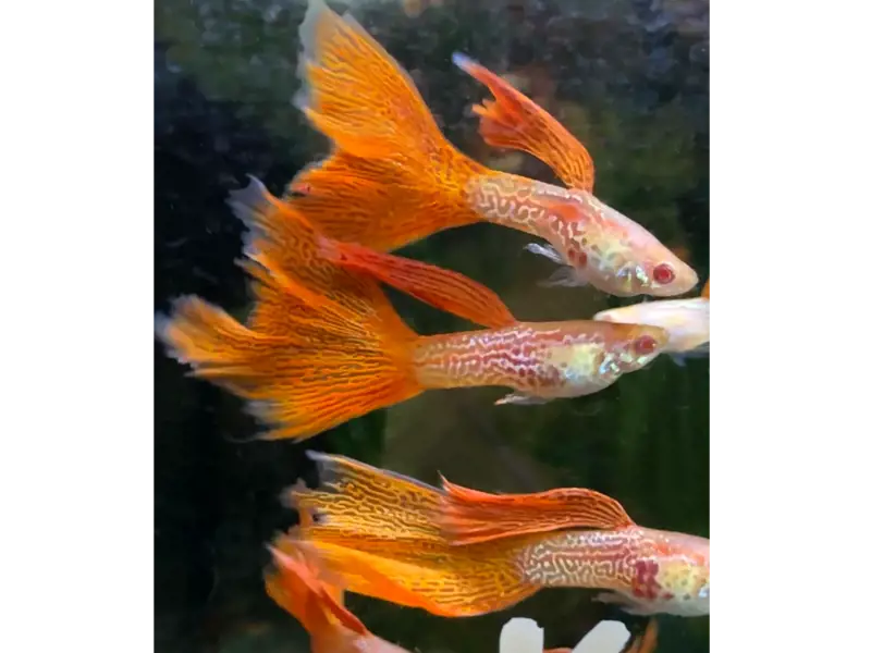 ALBINO RED LACE GUPPIES - M/F PAIR: Sizes and patterns of young adult pairs are similar to the photo, some slight variations between individual males. Also have fry pack options available, please email; additional photos can also be sent upon request. Will also send an additional jv or two per order if available. These gorgeous guppies are home bred and tank-raised in Oregon. Can group shipment with other guppies available. Send me a message if you have any questions on quantities, shipping, etc. Shipping will be the following Monday or Tuesday following payment, weather dependent.